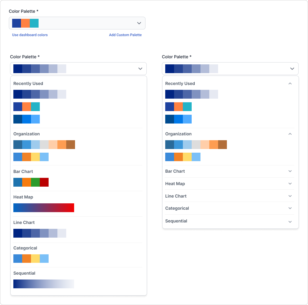After conducting user interviews and product walkthroughs, I compiled the feedback and redesigned the color palette selector. Users wanted the ability to see the organization and recently used color palettes. After hearing this feedback, I also looked into color palettes that are appropriate for data visualization in different scenarios. I added these palettes to the selector. Additionally, an always expanded option and collapsible option were added based on user feedback and needs.